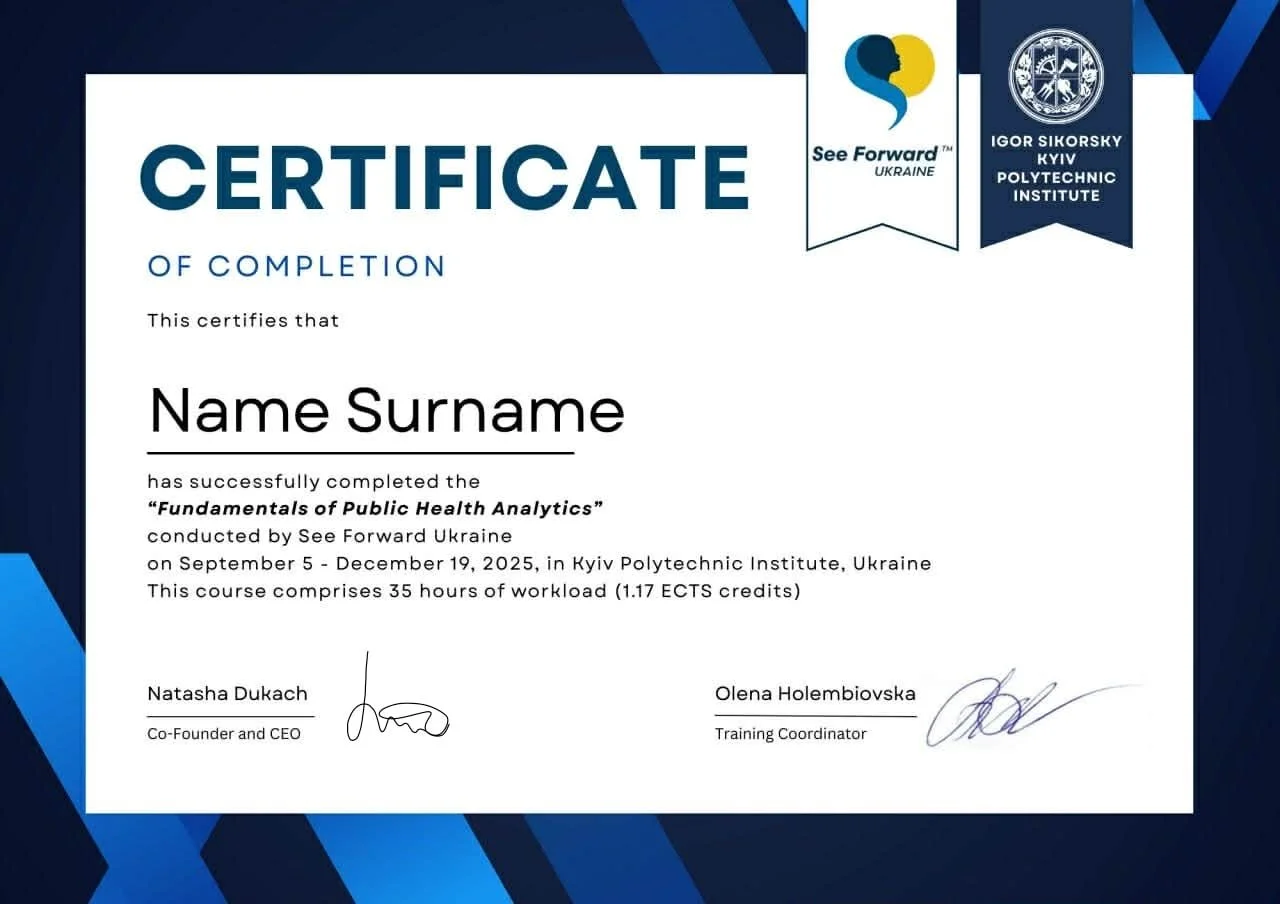 A hands on course focused on real public health datasets, core statistical thinking, and clear communication of findings. Mentees graduate with a portfolio ready project and a certificate issued through our joint program with Kyiv Polytechnic Institute.